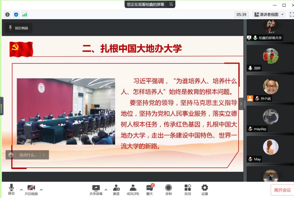 接着,支部同志讲微党课。柏鑫同学以《习近平:坚持党的领导传承红色基因扎根中国大地 走出一条建设中国特色世界一流大学新路》为主题,分享习近平总书记对青年的嘱托和关于扎根中国大地办大学的内容,并表示我们要牢记习近平总书记的殷殷嘱托,坚定不移听党话、跟党走,努力成长为堪当民族复兴重任的时代新人。