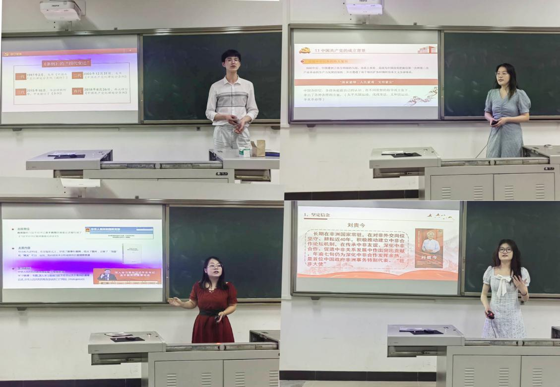 随后,10名毕业生党员开展了“在青春赛道上奋力跑出当代青年的最好成绩”微党课活动。陈延林、唐欣、薛露、寇虹四位同志从百年党史入手,引领大家向先辈学习;刘传珍、李佳欣、张路遥、王倩玲四位同志从习近平总书记的教育重要论述、疫情防控重要指示、共产党成立百年重要讲话、谈治国理政等讲话中,为大家指明了未来的进取方向;李丹洋同志带领大家学习了七一勋章先进人物事迹,号召大家在教员工涯中,要做到不仅仅教授知识,还要引导员工树立坚定的理想信念;周冬叶同志从共产党员廉洁自律准则入手,坚决履行八条规范,要做到“自觉培养高尚道德情操,努力弘扬中华民族传统美德,廉洁自律,接受监督,永葆党的先进性和纯洁性。”