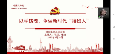 2023年4月28日19:00——21:00,研究生第五党支部在线上开展了主题为“以学铸魂,争做新时代接班人”的4月主题党日活动,本次会议由马甜和张洁同志主持,王强等15党员共同参与。