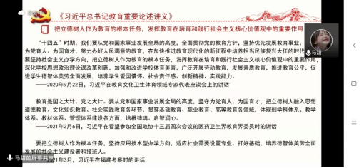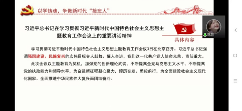 会议第二项是学习习近平总书记教育重要论述讲义。该论述对“围绕培养什么人、怎样培养人、为谁培养人这一根本问题,全面加强党对教育工作的领导”、“把立德树人作为教育的根本任务,发挥教育在培育和践行社会主义核心价值观中的重要作用”“培养有历史感责任感、志存高远的时代新人,为实现中华民族伟大复兴提供有力人才支撑”重要论述展开了学习回顾。