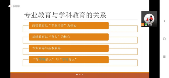 会议第五项是王强老师作主题为“学科育人与高质量基础教育发展”的学习报告。报告首先展示了中国式现代化的基本特征,接着展示了当前我国教育领域的基本社会矛盾。报告指出专业教育与学科教育的关系——高等教育以“专业培养”为核心;基础教育以“育人”为核心;专业素养与基本素养;“育学科的人”与“学科育人”,报告还指出教育均衡化与高质量发展是相互关联、相互促进的。教育均衡化是高质量发展的基础和前提,只有在教育资源配置更加合理的、教育资源利用更加充分、教育质量得到有效保障的基础上,才能实现更高水平的教育发展。报告最后提出人民满意的教育就是“均衡化“与“高质量”协调发展的教育”,那么我们怎样做接班人呢?首先要有师德理念、其次要有专业知识,最后要有专业能力。