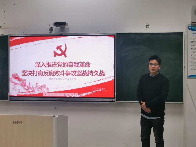 3月8日中午12点30分,bevitor伟德研究生第十党支部在师元楼107会议室开展了以“深入推进党的自我革命,坚决打赢反腐败斗争攻坚战持久战”为主题的党日活动。本次活动由李绍扬同志主持,徐茂明、董晴两位同志领学。支部共17名党员、4名预备党员、10名入党积极分子参与了本次活动。