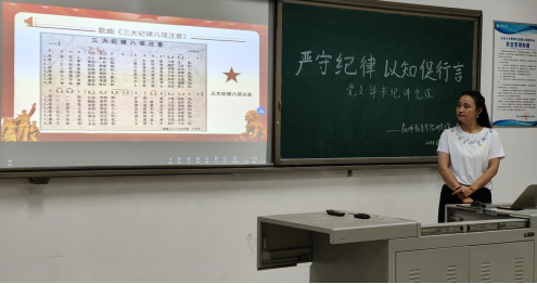 首先,颜婷婷书记以革命歌曲《三大纪律八项注意》,引出本次党课的主题。《三大纪律八项注意》创作于1935年,是党和军队与人民群众血肉联系的鲜明体现,是全心全意为人民服务根本宗旨的充分展示,是党和军队赢得人民群众爱戴和拥护的根本所在。说明了我们党从革命战争年间至今一直重视纪律意识和组织意识,纪律严明是我们党持续至今的光荣传统。