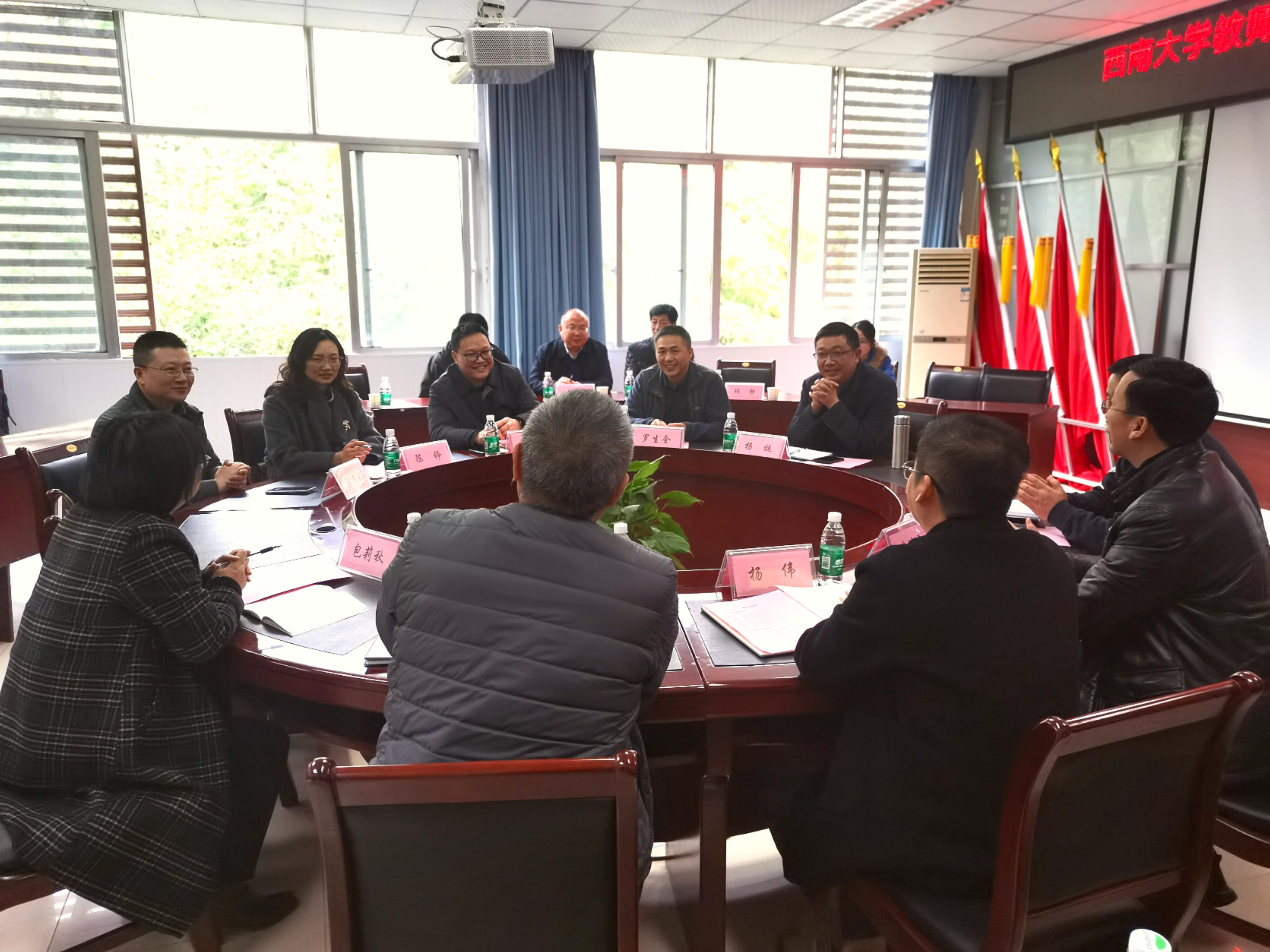 党委理论学习中心组成员首先抵达重庆市涪陵区教委召开事业发展研讨会,涪陵区委教育工委书记、教委主任孙应勇,区教委副主任程彬、副主任张凌洋(挂职)参加会议。孙应勇主任全面介绍了涪陵区教育状况,尤其是教师培养与乡村教师结构优化方面的具体举措。同时,也指出了当前涪陵教育面临的困境。针对这些现实挑战,与会双方积极谋划,达成一系列合作共识,决定从卓越教师提升计划、名师梯队计划、基础教育教师培训、拔尖创新人才培养及教学成果奖专项研究等方面开展多维度、多层次的合作,共同推进涪陵区基础教育发展。