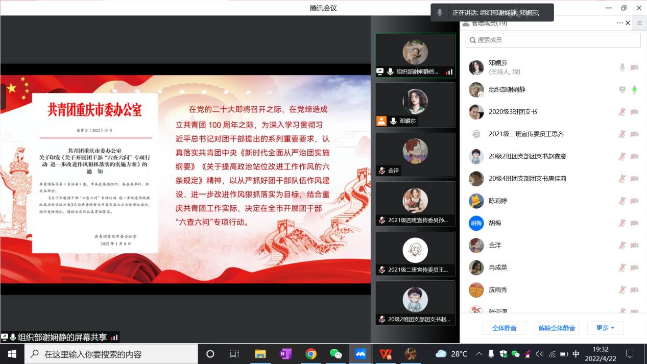 为深入学习宣传贯彻习近平新时代中国特色社会主义思想,特别是习近平总书记关于青年工作的重要论述和工作要求,全面贯彻落实重庆市委五届十一次全会精神、团十八届六中全会精神和团市委《关于开展团干部“六查六问”专项行动进一步改进作风狠抓落实的实施方案》精神,全面改进新时代共青团干部作风形象,bevitor伟德团委于4月22日晚7点召开团干部“六查六问”专项行动部署动员会,并进行第一次集中学习。团委书记郑婷出席会议,团委副书记、团委组织部、宣传部负责人、各团支部团支书、组织委员、宣传委员参加会议。会议由组织部干事邓媚莎主持。