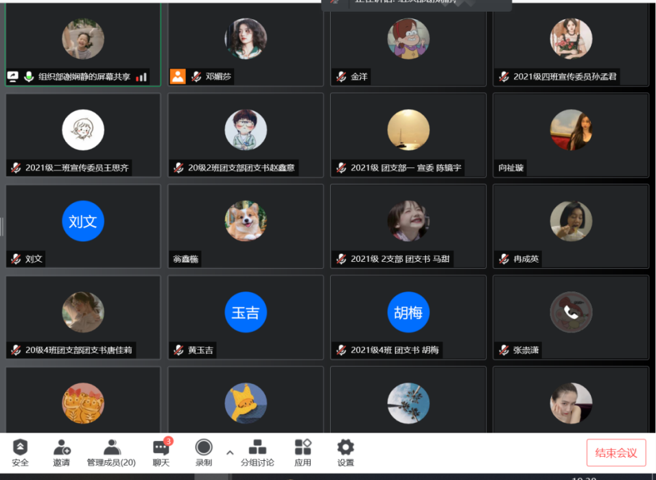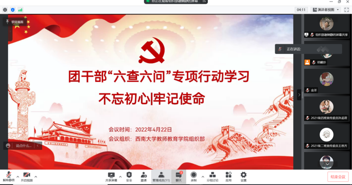 首先,组织部干事谢娴静从“六查六问”专项行动指导思想、工作原则、工作任务进行学习分享,具体围绕“六查”查什么,“六问”问什么展开,指出六查六问内容包括:查信念问忠诚,推动团干部在政治上更坚定;查学习问理论,推动团干部在思想上更成熟;查举措问成效,推动团干部在能力上更突出;查履职问落实,推动团干部在担当上更自觉;查立场问初心,推动团干部在作风上更过硬;查守纪问清廉,推动团干部在自律上更严苛。
