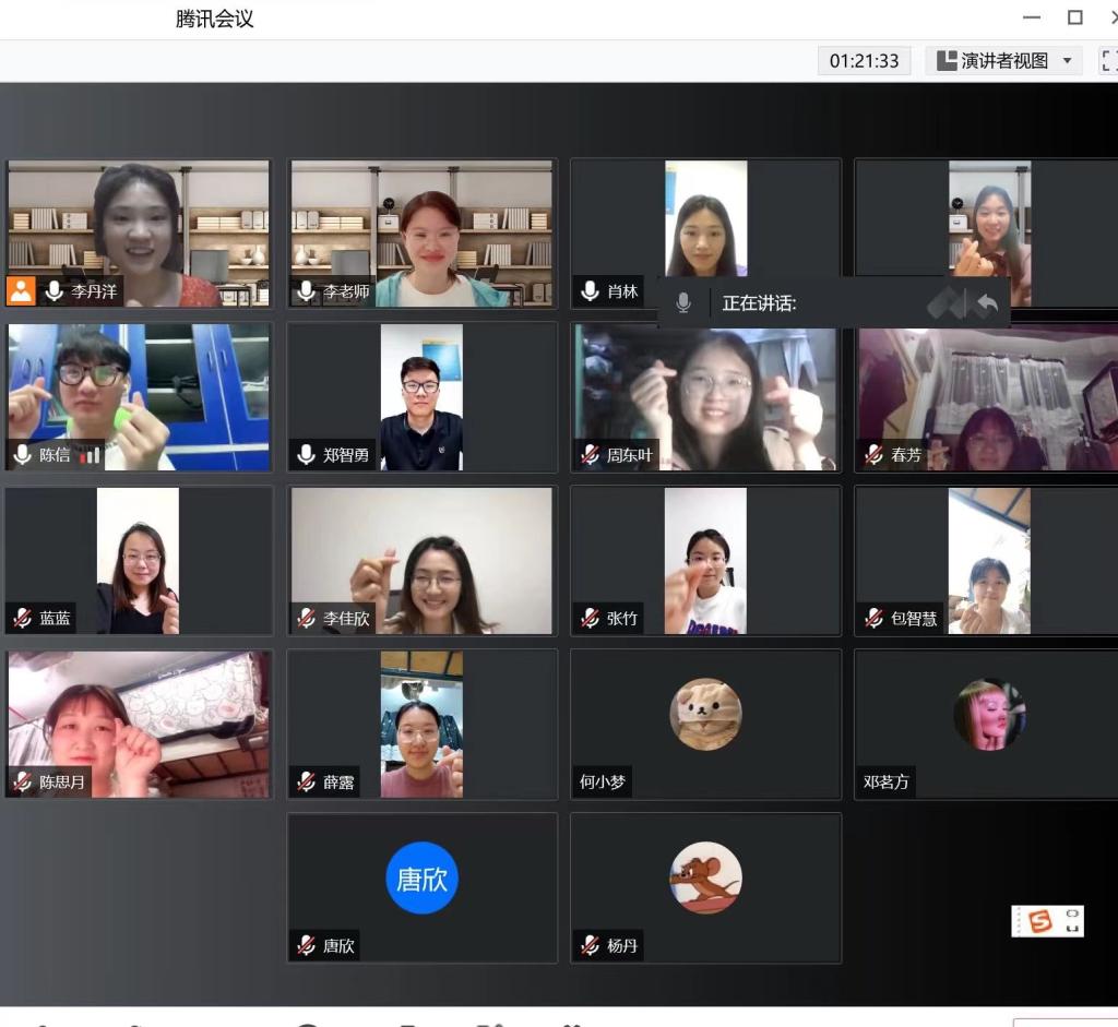 在干货满满的经验分享之后是提问环节,同学们踊跃发言,就研究设计介绍、提问应答和图表呈现等具体问题与两位博士进行了互动交流。最后,班主任李欣莲老师进行总结。她首先肯定和感谢了两位博士为这次分享会所作的精心准备,既有大结构的流程指导,也有小细节的注意事项,为与会同学在答辩中有更好表现充分助力。李老师再次强调了毕业答辩的重要性,以及答辩准备中的关键点,希望大家能够引起足够的重视、做好充分的准备,为自己的研究生学习生涯画上满意的句号。