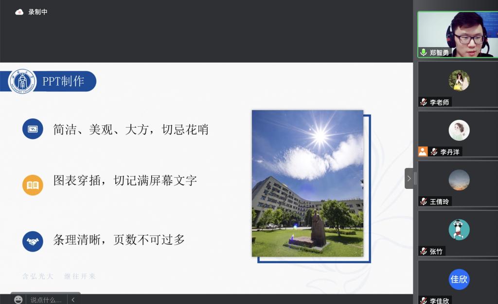 接着,郑智勇博士针对论文答辩中的问答环节进行了重点分享。如回答问题应尽可能的简明扼要、直击重点,不宜过于发散,答非所问;对诸如研究的主要内容、思路方法、研究结论、主要贡献、新意、不足等问题要重点准备等等。此外,他还就论文答辩PPT制作的形式和内容提出了详细的指导和建议。郑博士表示,答辩PPT要简洁、美观、大方,切忌花哨;图文并茂,切记满屏幕文字;条理清晰,页数不宜过多。
