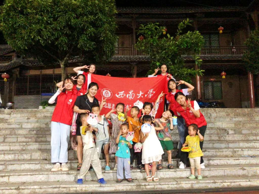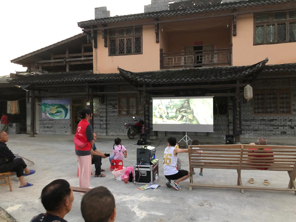 傍晚,小分队在文化广场协助文广新局马晓容老师布置观影场地,组织老人观看电影《铁道飞虎》,丰富他们的精神世界。同时,组织村里的留守儿童开展了一场启智润心、求索笃行的趣味活动。小分队成员带领孩子们进行桃花朵朵开、丢手绢等游戏,讲述励志故事、宣传安全常识,和他们谈心谈话,在生活、学习和思想上给予陪伴和鼓励,展示了新时代青年们的新面貌、新担当、新作为。