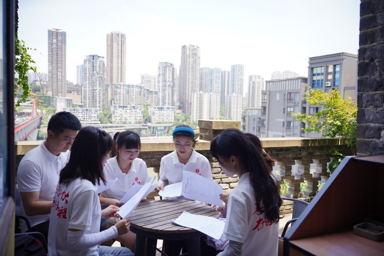 上午,实践小队到达曾家岩50号,先后参观周公馆、曾家岩书院。周公馆,一栋砖木混合的小楼,古朴又神秘,是我们党领导国统区斗争和抗日民族统一战线的前沿阵地。小队成员集体瞻仰周公馆门前的总理雕像,中国共产党筚路蓝缕的奋斗史与创业史在小队成员的脑海中涌荡,成员们对在极端恶劣局势下风雨兼程的革命前辈肃然起敬。周公馆旁的曾家岩书院,是一家主题图书馆,古色古香的桌椅、老式的台灯、墙上的老重庆照片,书架上“抗战文化”“红色经典”等主题的书籍,让历史氛围感萦绕四周。小队成员在书院通过看展览、观影片等方式感受重庆厚重的历史文化。随后,实践小队从周公馆的陈列意义、重庆红色文化的宣传、青年人眼中的爱国爱主义等方面对馆内参观者进行采访。青年参观者回答道,周公馆的陈列有利于参观者更加直观地感受到中国共产党在挽救民族危亡中发挥的当中发挥的不可替代的作用,更加深入全面地理解红色文化,并表示重庆红色文化的资源还有待进一步深挖与宣传。此外,青年参观者还提到,红色文化的宣传对于培养青年人的爱国主义精神具有重要意义,我们应该带着这些不可磨灭的中国印记,走中国自己的路。