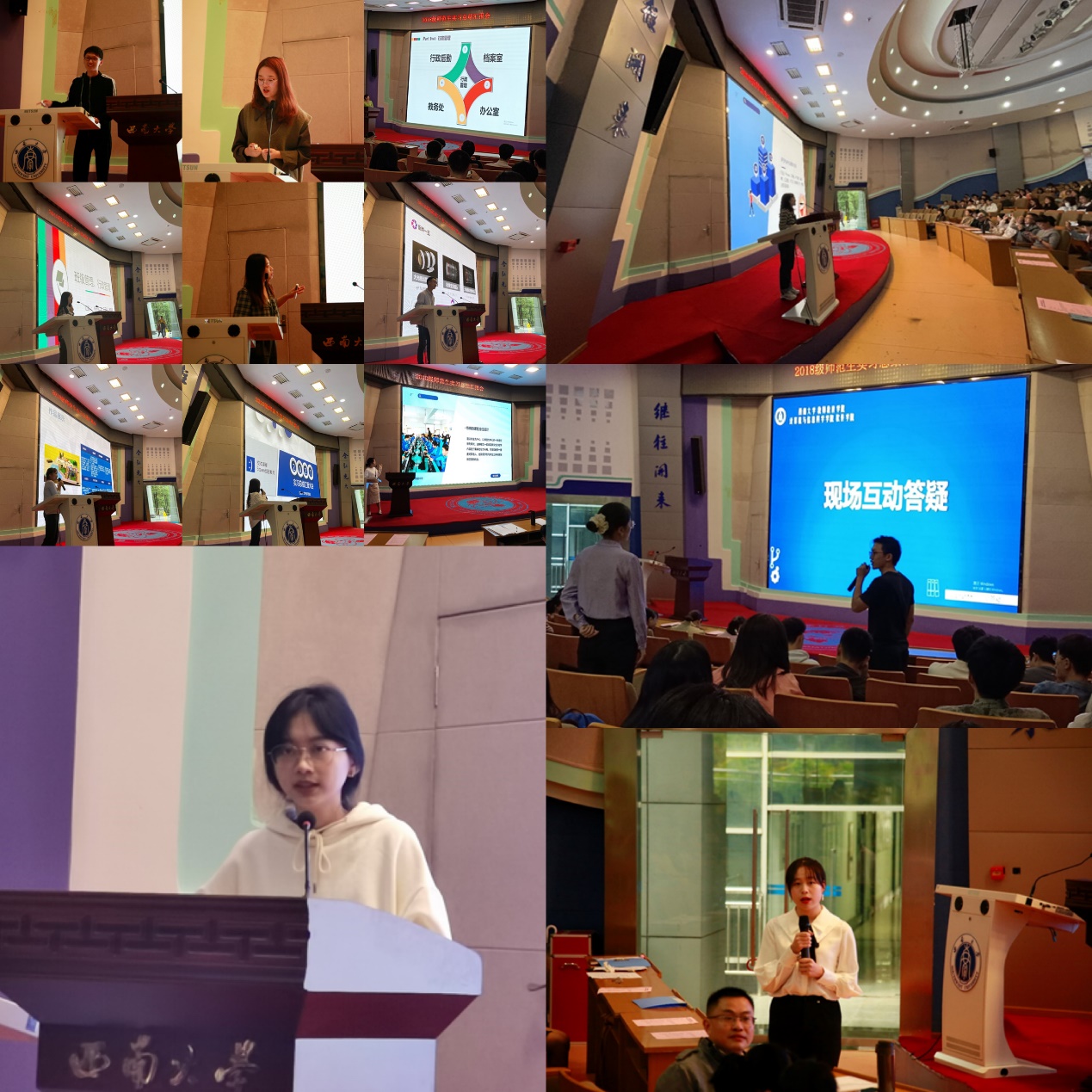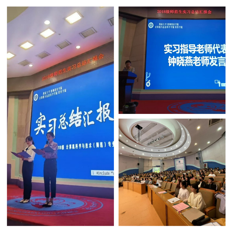 接下来由来自不同实习点的同学对实习工作进行总结汇报。此次汇报打破以往以公司为单位依次上台分享的惯例,采取以信息技术教师发展的不同方向(包含日常教学、摄录编、校本课程\STEAM课程、教学管理、信息技术竞赛以及其他特色工作等六个方面)为依据,选取优秀的实习生代表,对实习工作进行汇报和经验分享。