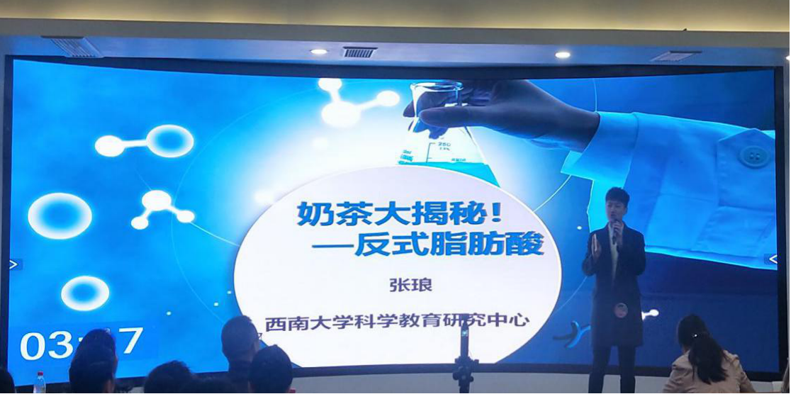 公司首先上场的是张琅同学,他讲解的题目是“奶茶大揭秘”,利用生活中大家都喜欢喝的奶茶为主题,吸引评委老师和观众的注意力,随后,他讲解了奶茶中关键成分反式脂肪酸以及该成分在其他美食的含量,最后为大家提供了两条生活小贴士,鼓励大家更加健康地生活。