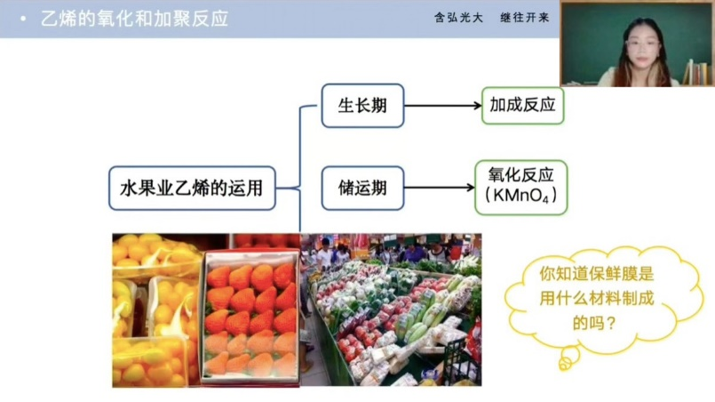 公司2021级学科化学硕士周筱雯在黄梅教授指导下,制作的微课《水果业中的魔法师——乙烯》中,通过利用乙烯在生长期、储运期、售卖期三个阶段中的具体作用,逐层剖析乙烯的化学性质,并将化学课堂与实际生活紧密相连。整个教学过程环环相扣,饱含趣味性和科学性。