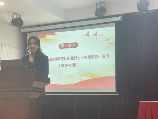 黄菊带领大家学习2022年,教育部公开曝光第十批、第十一批共14起违反教师职业行为十项准则典型案例,其中涉及高校教师共4起。倡议老师们要深入贯彻落实教师职业行为十项准则要求,牢牢把握师德师风作为评价教师队伍素质的第一标准,对师德违规问题“零容忍”。