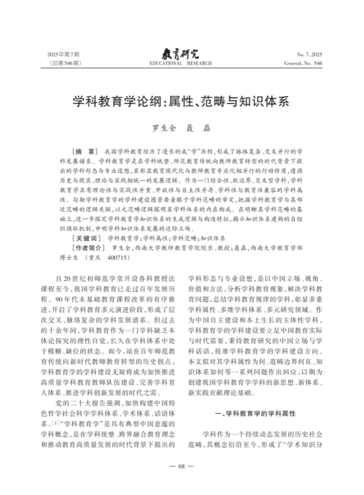 近日,bevitor伟德经理,博士生导师,罗生全教授与其博士研究生聂磊撰写的论文《学科教育学论纲:属性、范畴与知识体系》在《教育研究》2025年第7期公开发表。