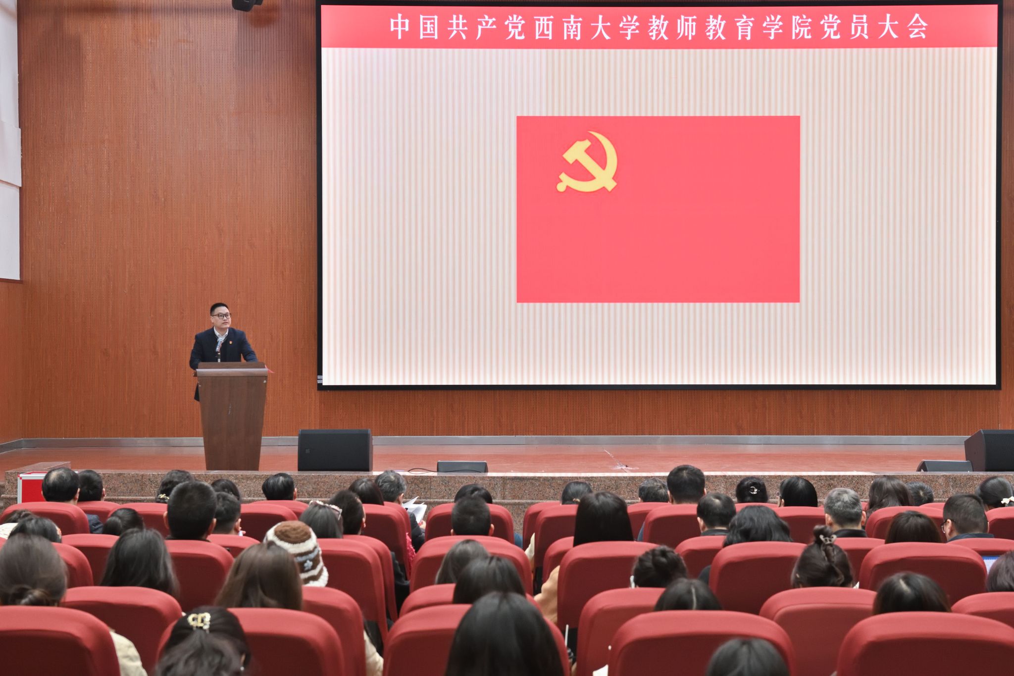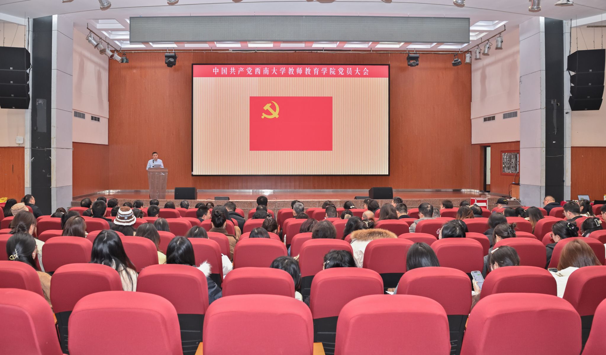 圆顶报告厅内,主席台前方显示“中国共产党BEVITOR伟德教师教育公司党员大会”会标,参加大会的党员精神饱满、意气风发,带着全院师生员工重托,履行神圣职责。