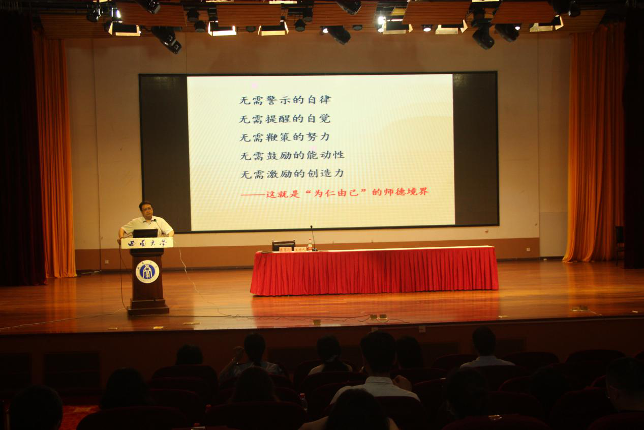郑家福书记以《传统文化视域下的教师角色及师德遵循》作了发言。郑书记从历史文化的角度探讨了师德师风问题。他认为,优良的师德师风是中华传统文化的重要组成部分,并重点谈到古人对教师选择的价值取向。郑书记指出,在传统教师层面,教师承担着传道、授业、解惑的重任,教师有一定的社会地位,古人对教师提出了各种要求,要求教师有崇高的道德理想,高尚的道德情操。从某种意义上来讲,今天的教师仍然不过是人类历史发展中的教师,其承担的历史使命以及社会对教师的角色期待并没有根本性的变化。今天的师德师风建设,仍然要重视传统文化,重视它的根和源。